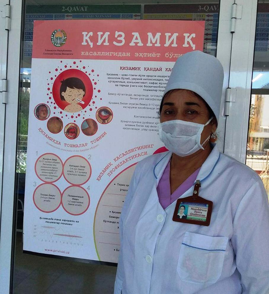 Наша сегодняшняя героиня – прививочная медсестра семейной поликлиники № 2 в Термезе, Масобирова Зухра Касимовна. Она – одна из самых опытных врачей, на которую наши матери, заботясь о будущем своих детей, всегда смотрят с надеждой. Она является уважаемым и добрым человеком, неустанно трудящаяся день и ночь во благо здоровья людей, и с честью оправдывает доверие, оказанное ей в сфере вакцинации детей от различных инфекционных заболеваний.
